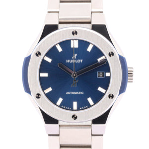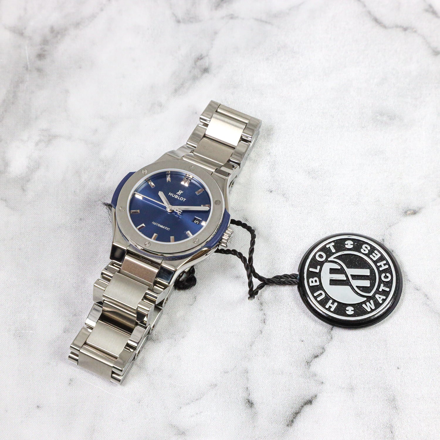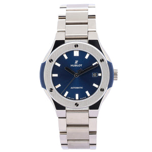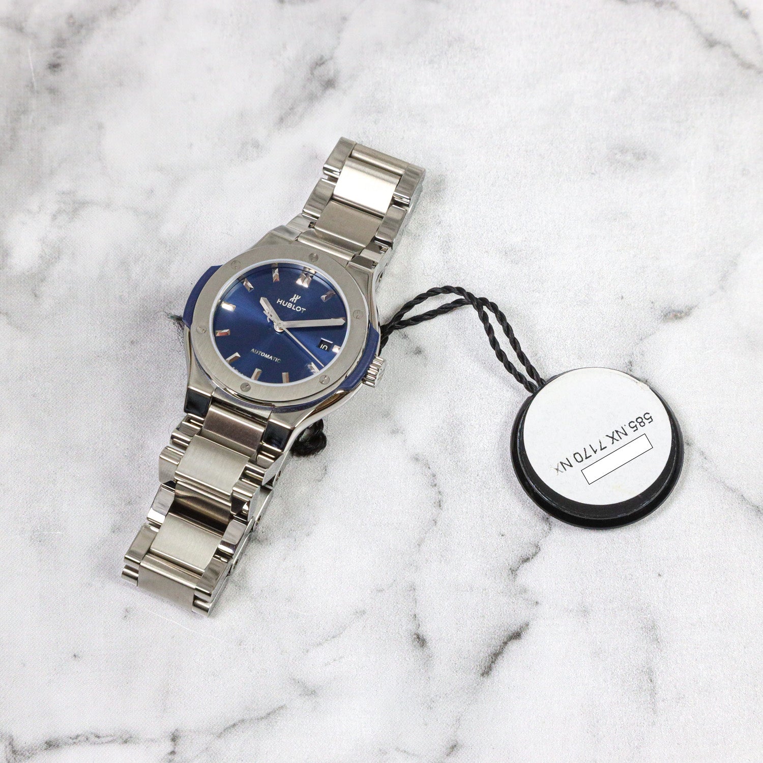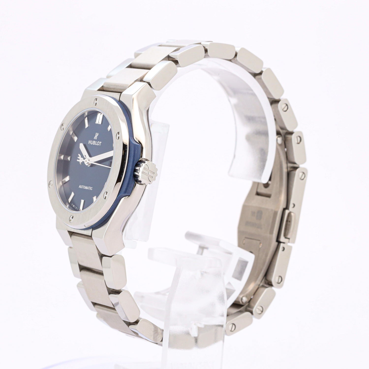Die Hublot Classic Fusion Titanium Blue 33mm (Ref. 585.NX.7170.NX) vereint elegantes Design mit sportlicher Raffinesse in einer kompakten Größe. Das markante Gehäuse aus satiniertem und poliertem Titan verleiht der Uhr eine moderne Leichtigkeit und sorgt gleichzeitig für außergewöhnliche Robustheit.