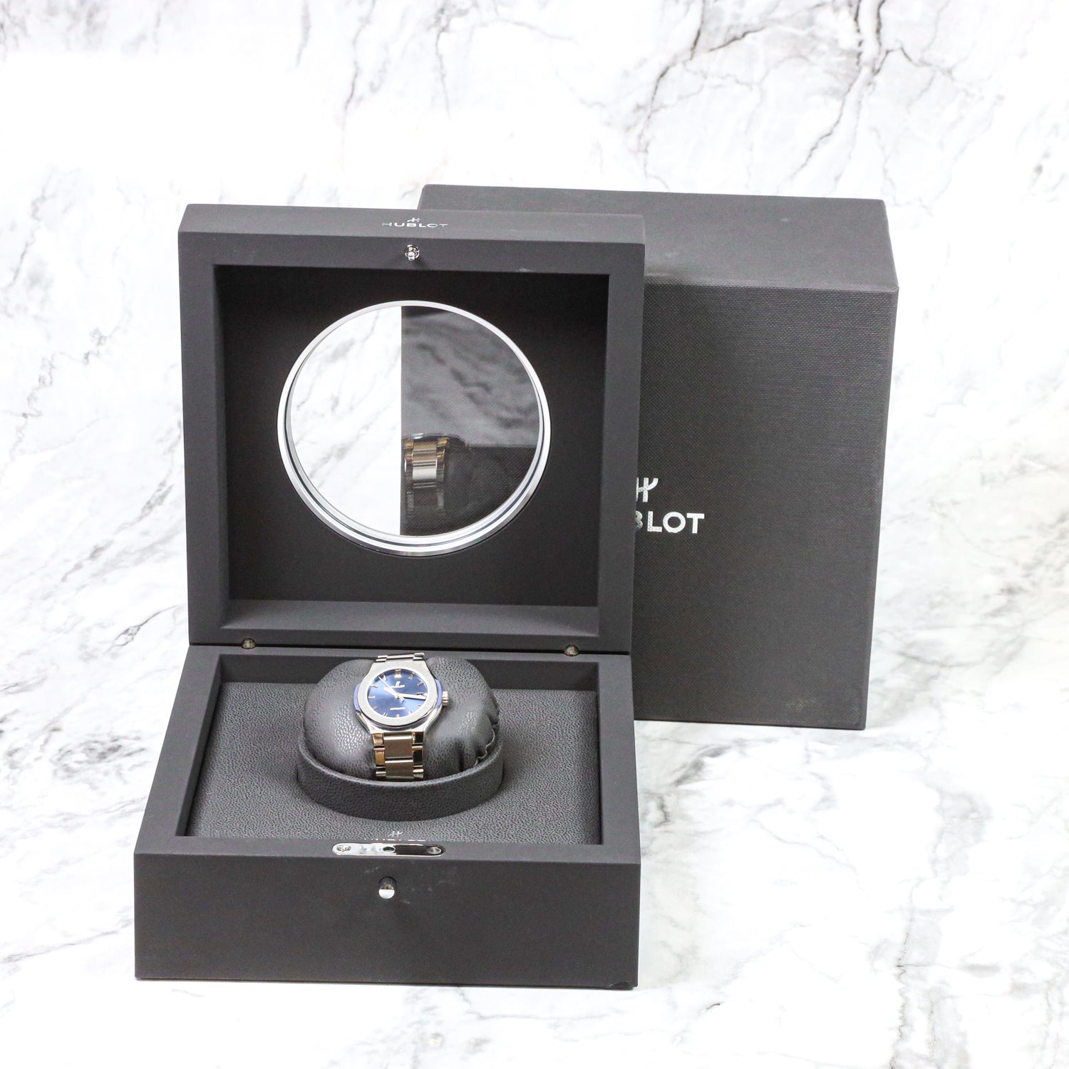 Das tiefblaue Sonnenschliff-Zifferblatt strahlt zeitlose Eleganz aus und harmoniert perfekt mit den applizierten Indizes und den schlanken Zeigern in Rhodium-Finish. Der klassische Hublot-Schriftzug sowie das Datumsfenster bei 3 Uhr runden das ausgewogene Design ab.