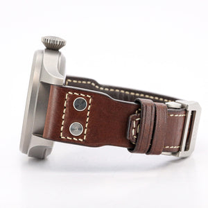 Die Uhr verfügt über eine Datumsanzeige bei 6 Uhr, eine verschraubte Krone im typischen „Onion“-Design und ein entspiegeltes Saphirglas. Getragen wird sie an einem hochwertigen braunen Kalbslederarmband mit Dornschließe.