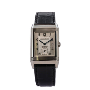 Das vordere Zifferblatt präsentiert sich in elegantem Silberton mit klassischer Guillochierung und arabischen Ziffern, während das rückseitige Zifferblatt in dunklem, kontrastreichem Design gehalten ist und zusätzliche Raffinesse bietet. Im Inneren arbeitet das legendäre Handaufzugskaliber Jaeger-LeCoultre 854, das für seine Präzision und Zuverlässigkeit geschätzt wird.
