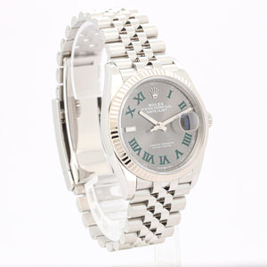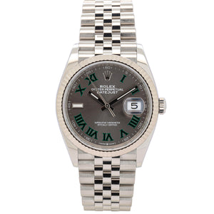 Diese elegante Rolex Datejust 36 mit der Referenz 126234 vereint sportliche Raffinesse mit klassischer Eleganz. Das markante „Wimbledon Dial“ – ein graues Zifferblatt mit grünen römischen Ziffern – verleiht der Uhr einen unverwechselbaren und modernen Look, der sofort ins Auge fällt.