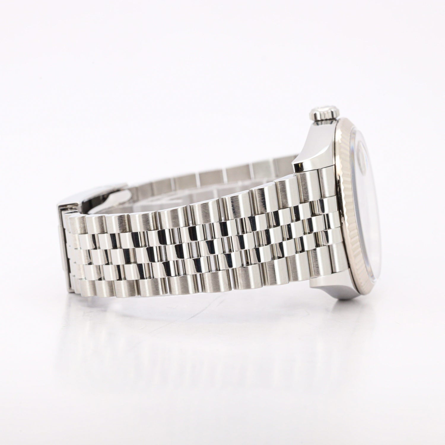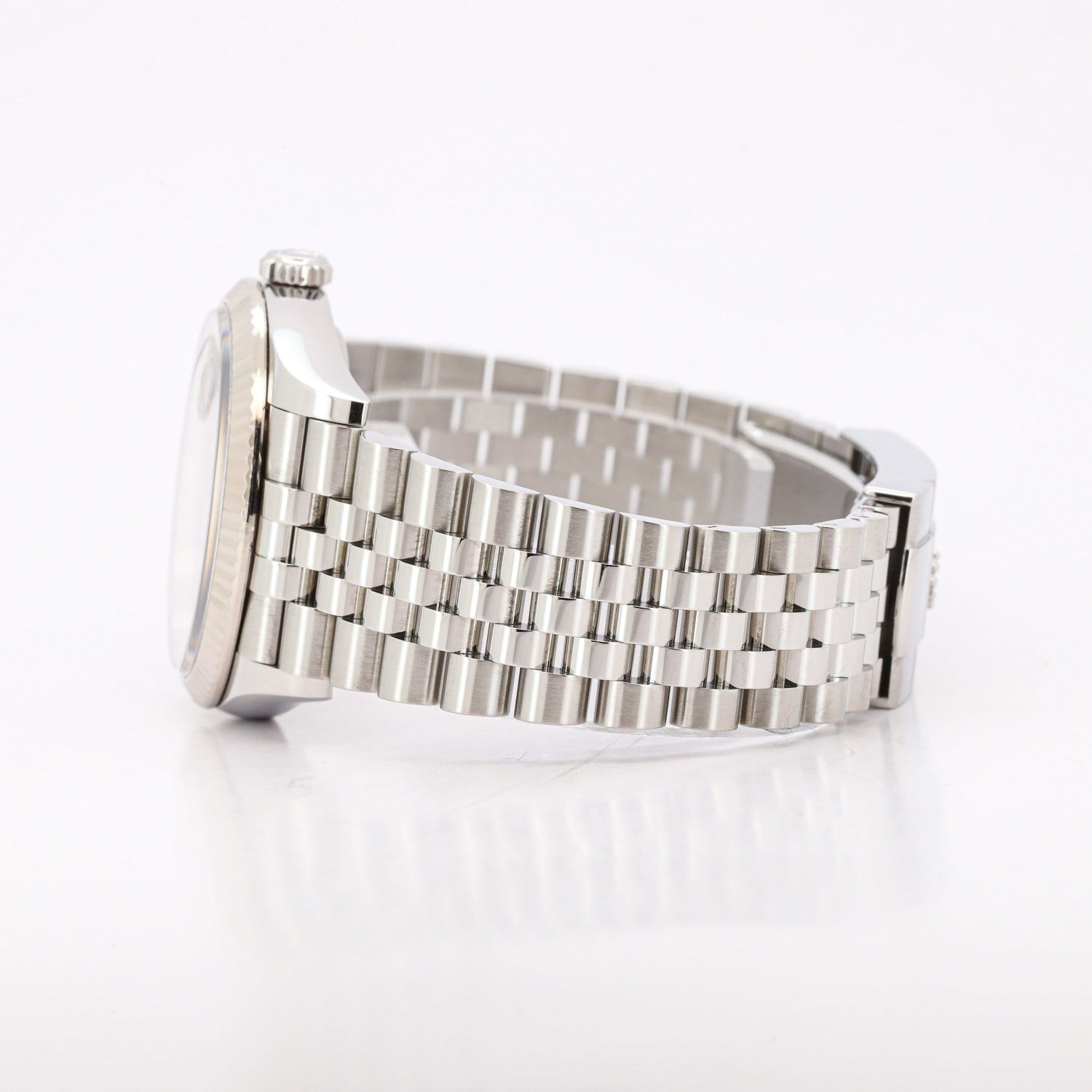 Das 36-mm-Gehäuse aus Edelstahl (Oystersteel) wird von einer edlen Weißgold-Riffel-Lünette gekrönt, die das Licht auf einzigartige Weise reflektiert. Am Handgelenk sitzt die Uhr dank des komfortablen Jubilee-Bandes besonders angenehm und elegant.
