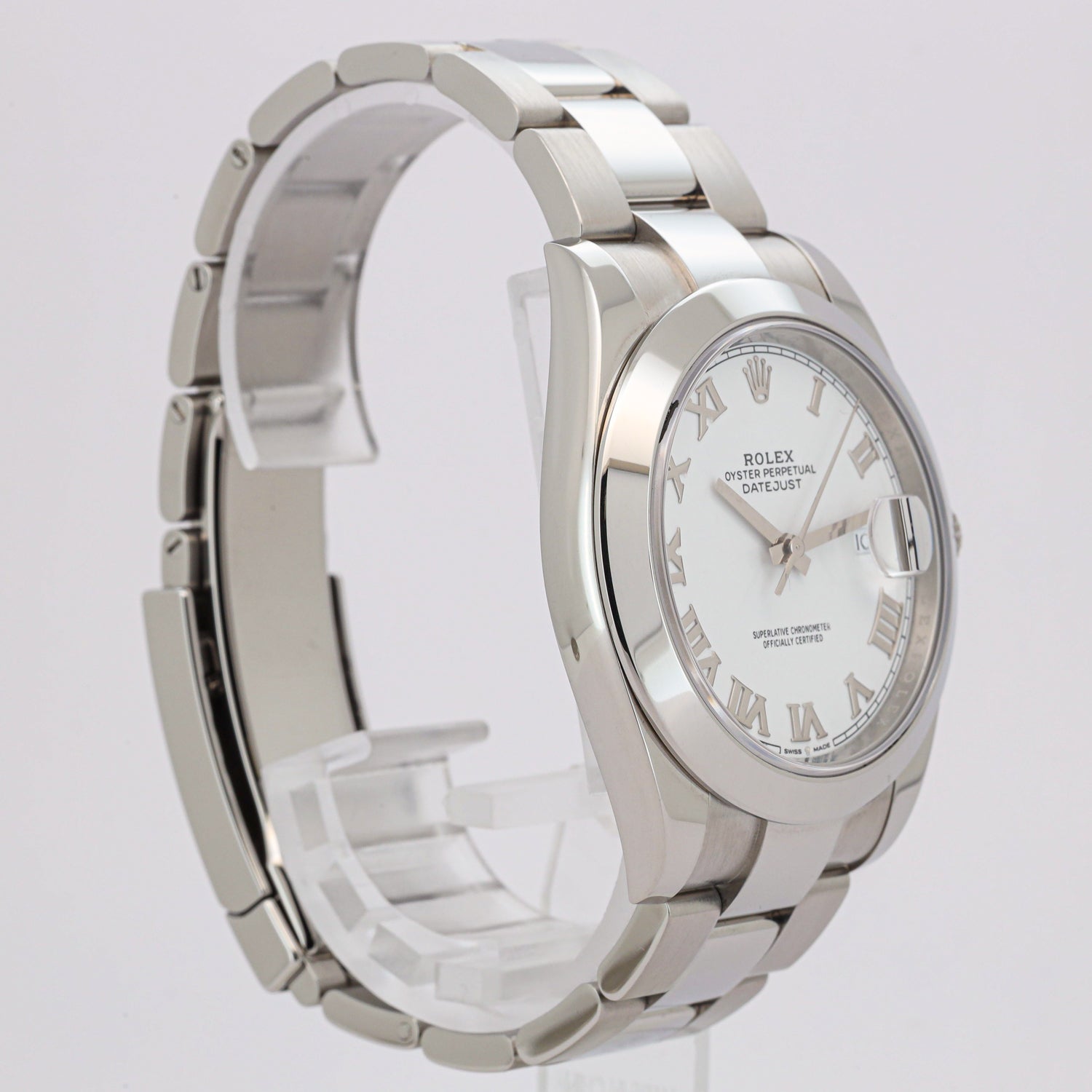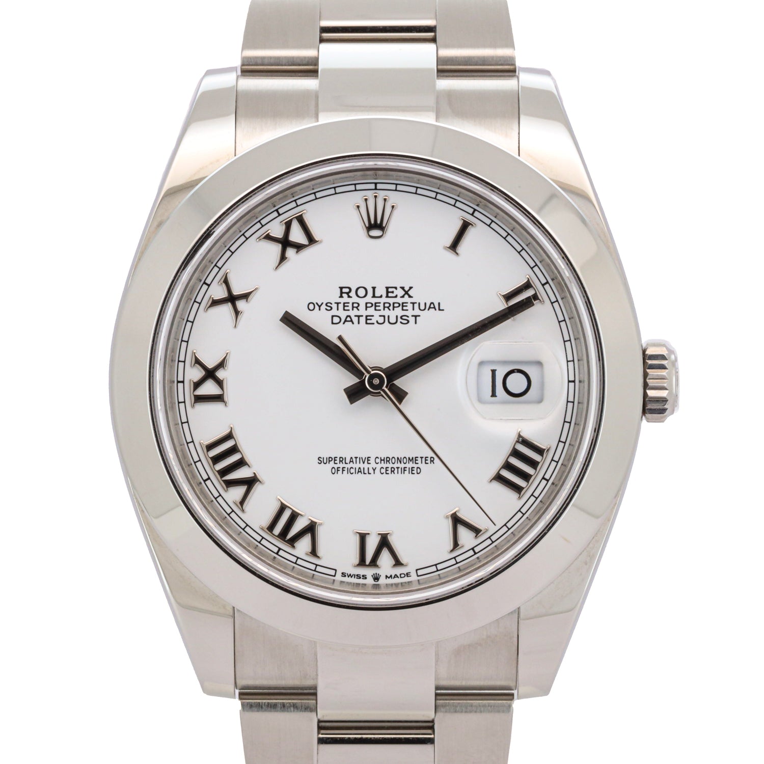 Die Rolex Datejust 41 Referenz 126300 präsentiert sich hier in einem absolut zeitlosen und eleganten Design. Das strahlend weiße Zifferblatt mit aufgesetzten römischen Indizes verleiht der Uhr eine klassische Note und sorgt zugleich für exzellente Ablesbarkeit. Zusammen mit dem polierten und satinierten Oyster-Gehäuse in 41 mm entsteht ein moderner, aber dennoch traditioneller Look, wie man ihn von Rolex erwartet.