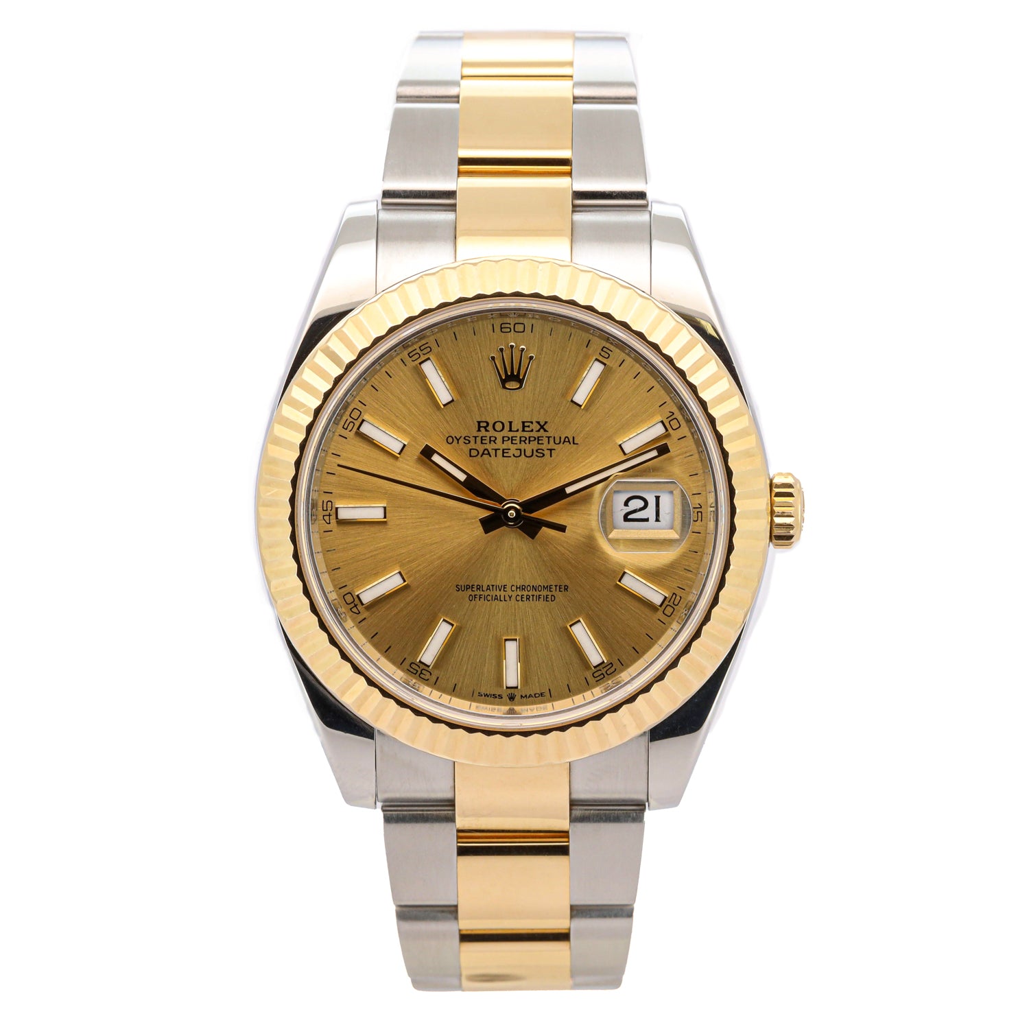 Das champagnerfarbene Zifferblatt mit applizierten Index- oder römischen Stundenmarkierungen (je nach Ausführung) und der legendären Datumsanzeige mit Zykloplupe strahlt warme Eleganz aus. Das harmonische Zusammenspiel von Goldtönen und Edelstahl unterstreicht den luxuriösen Charakter dieser Datejust.