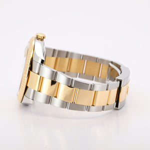 Das 41 mm große Oyster-Gehäuse besteht aus Rolesor, einer Kombination aus Edelstahl (Oystersteel) und 18 Karat Gelbgold. Die ikonische geriffelte Lünette aus massivem Gelbgold verleiht der Uhr einen unverwechselbaren Glanz und sorgt für den typischen Rolex-Charakter.