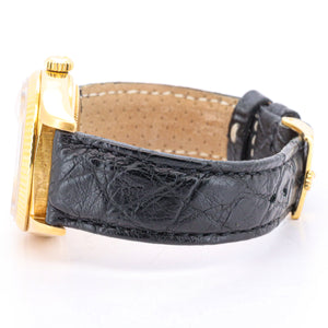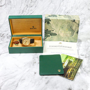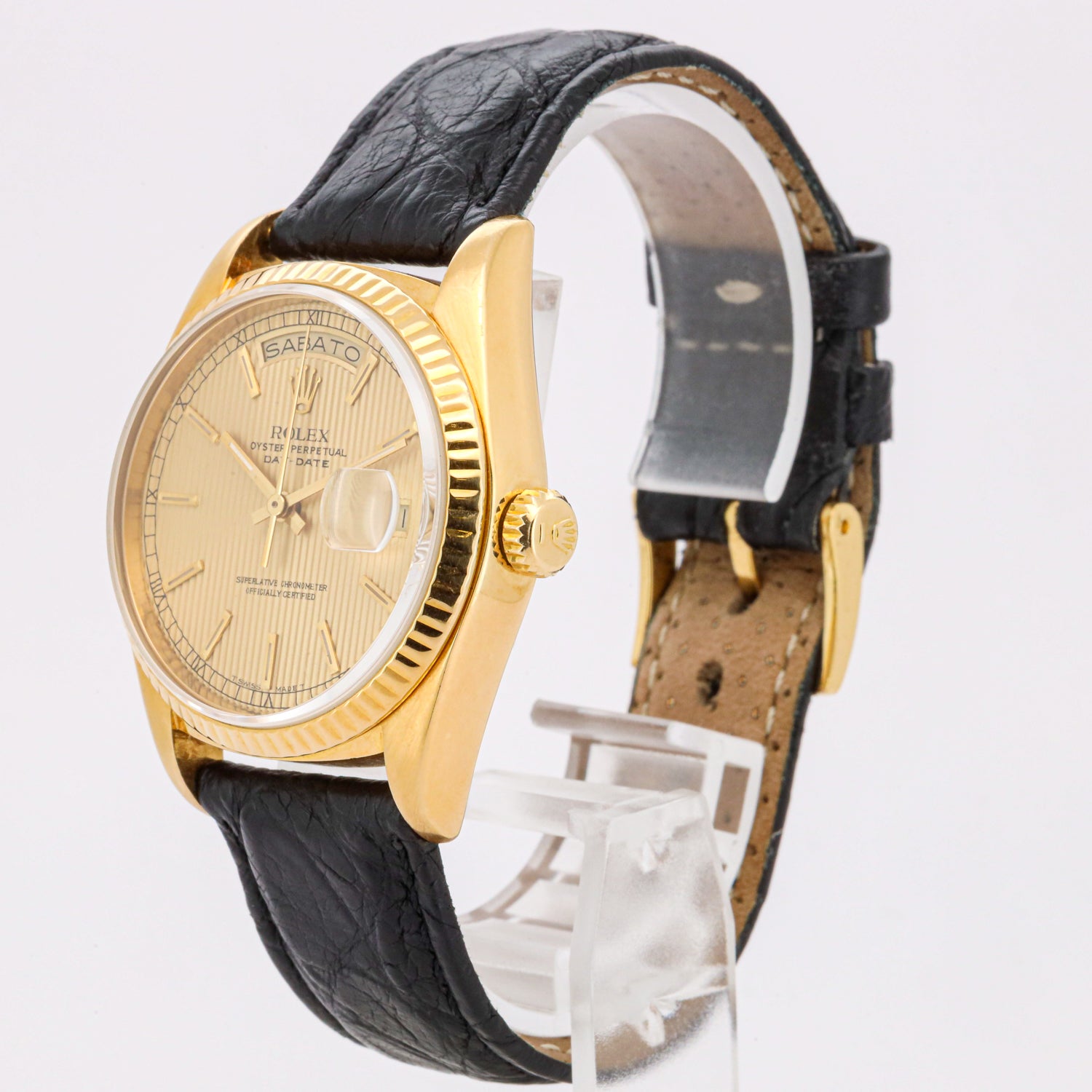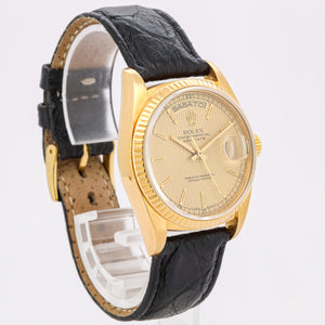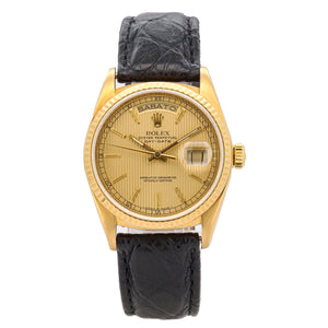 Diese edle Rolex Day-Date Ref. 18038 verkörpert den klassischen Luxus der 1980er Jahre in seiner reinsten Form. Gefertigt aus massivem 18 Karat Gelbgold, strahlt sie zeitlose Eleganz und höchste Uhrmacherkunst aus. Das goldene Zifferblatt mit aufgesetzten Indizes und dem legendären Day-Date-Anzeige-Fenster bei 12 und 3 Uhr sorgt für ein harmonisches, warmes Gesamtbild.