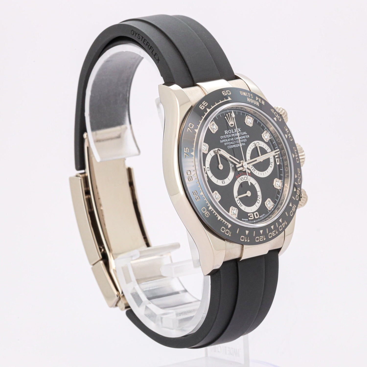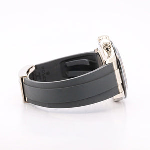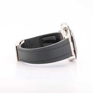 Das schwarze Zifferblatt mit applizierten Diamantindizes sorgt für einen faszinierenden Kontrast und verleiht der Uhr eine außergewöhnlich edle und zugleich sportliche Ausstrahlung. Die drei silberfarbenen Totalisatoren unterstreichen die Funktionalität des Chronographen und schaffen eine harmonische Balance zwischen Präzision und Design.