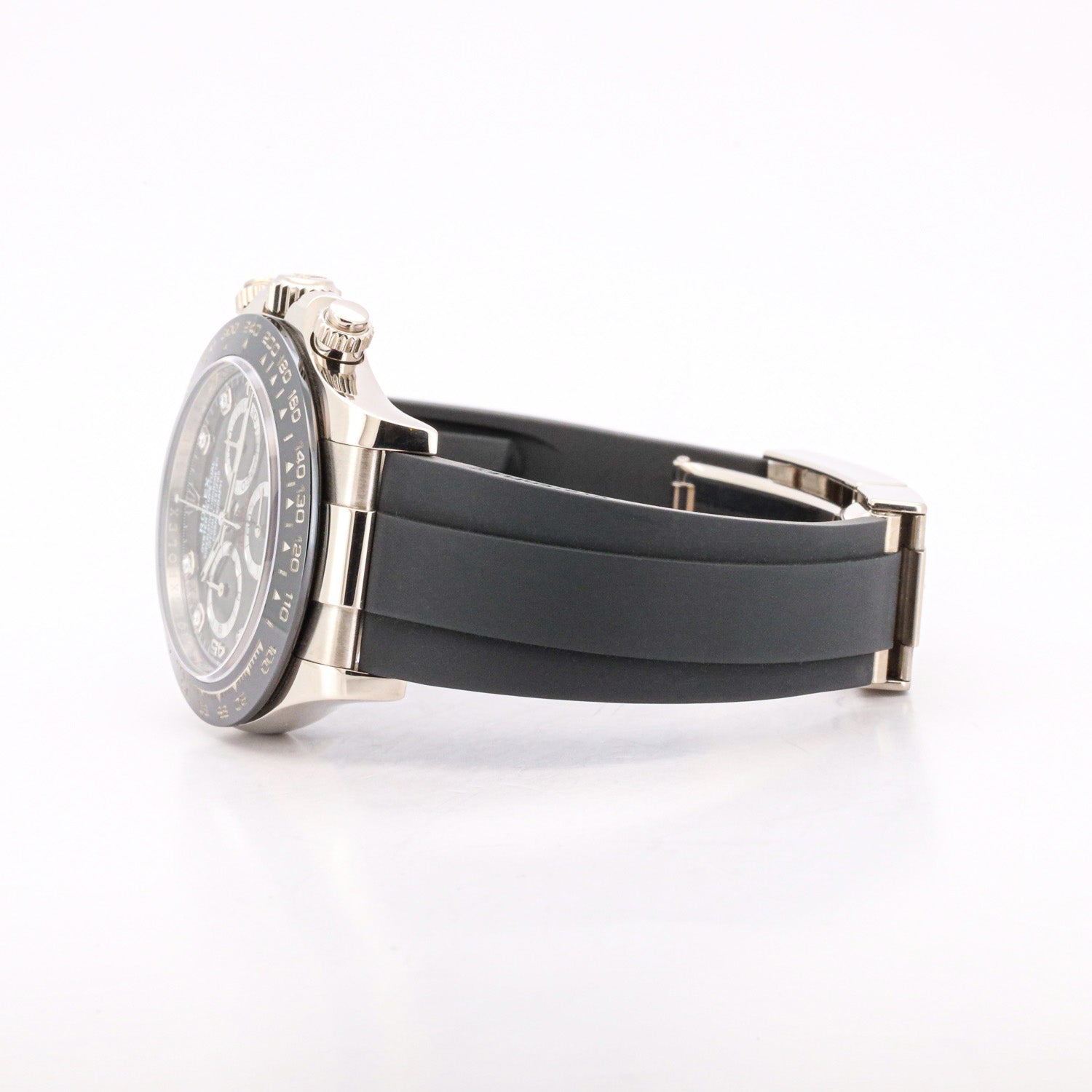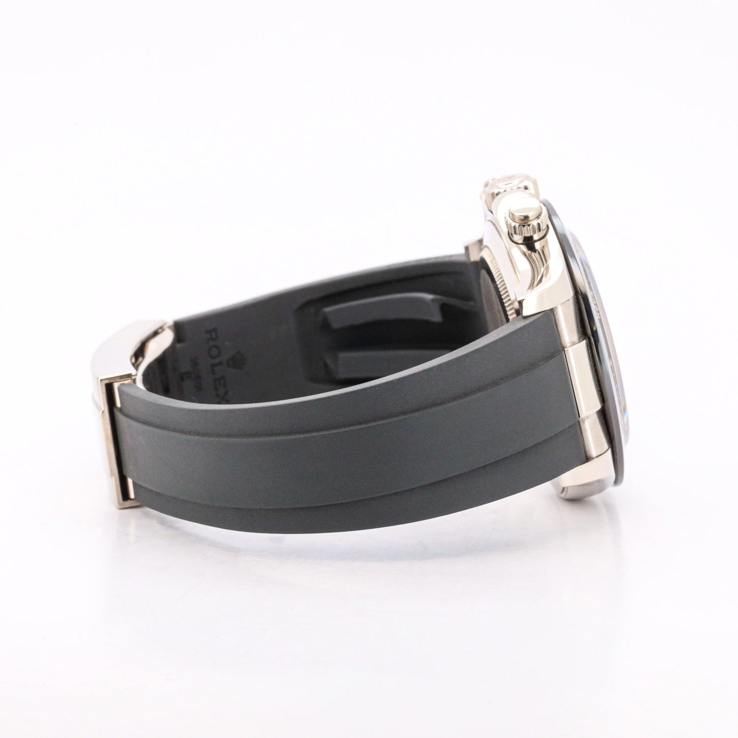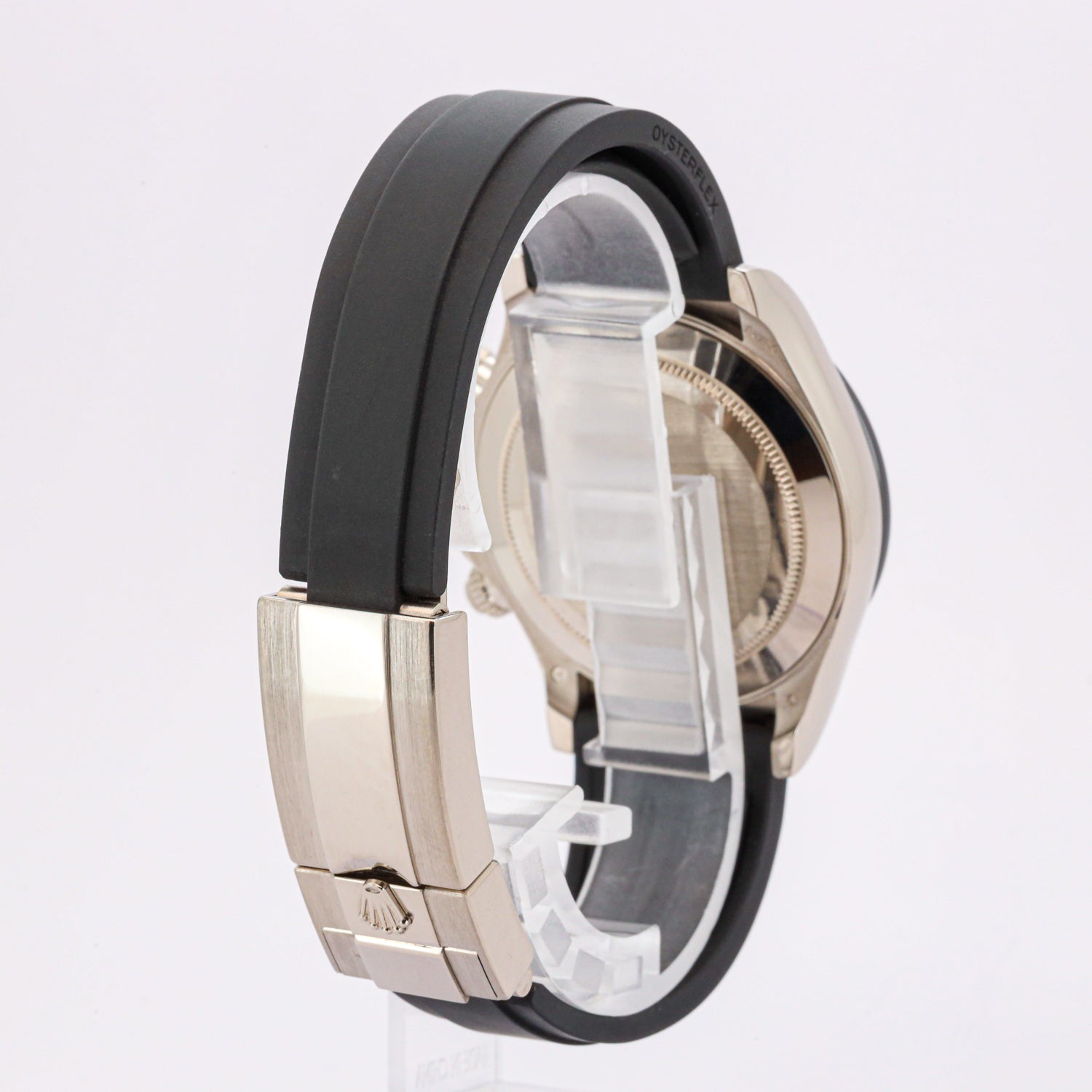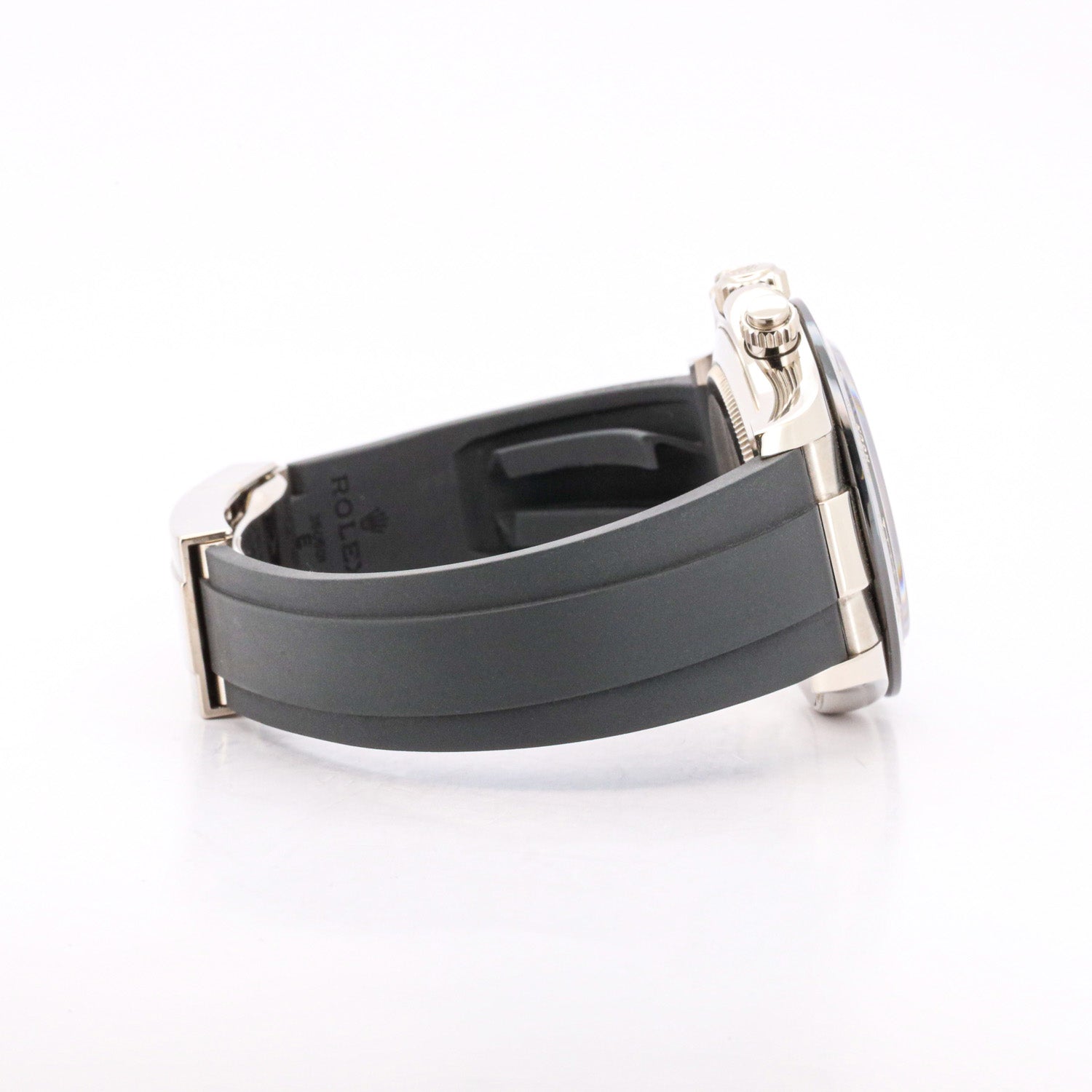 Das elegante und zugleich sportliche Oysterflex-Armband kombiniert den Tragekomfort eines Elastomerbandes mit der Stabilität eines Metallkerns – abgerundet durch eine Oysterlock-Faltschließe aus Weißgold für maximale Sicherheit.