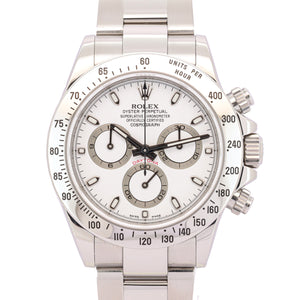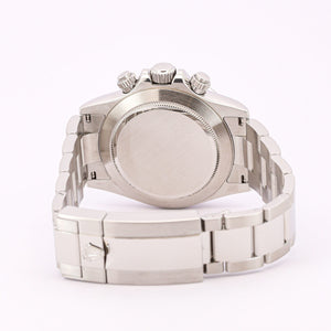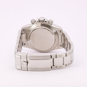 Das 40-mm-Gehäuse aus Edelstahl (Oystersteel) überzeugt durch seine robuste Verarbeitung und die klassische Daytona-Linie. Die feststehende Edelstahl-Lünette mit eingravierter Tachymeterskala unterstreicht den sportlichen Charakter der Uhr und ermöglicht die Messung von Durchschnittsgeschwindigkeiten. Das klare weiße Zifferblatt mit schwarzen Totalisatoren sorgt für eine hervorragende Ablesbarkeit und den typischen, sehr harmonischen Daytona-Kontrast.