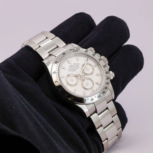Zum Verkauf steht eine Rolex Cosmograph Daytona Referenz 116520 mit begehrtem weißem Zifferblatt, einer der ikonischsten und gefragtesten Sportchronographen von Rolex. Dieses Modell besticht durch seine zeitlose Eleganz, sportliche Funktionalität und hohe Wertstabilität.