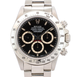 Diese begehrte Rolex Daytona Ref. 16520 stammt aus der legendären „Zenith“-Ära und zählt zu den kultigsten Chronographen der Marke. Das Modell wird vom robusten und präzisen Kaliber 4030 angetrieben – einer von Rolex überarbeiteten Version des Zenith El Primero Werks – und markiert den Übergang zwischen Vintage und moderner Daytona.