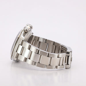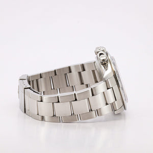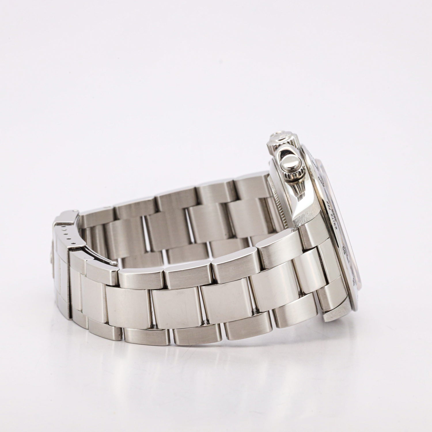 Das klassische schwarze Zifferblatt mit kontrastierenden silbernen Totalisatoren, das 40 mm Edelstahlgehäuse und die polierte Tachymeter-Lünette verleihen der Uhr ihren ikonischen Daytona-Look. Mit verschraubten Drückern, verschraubter Krone und dem Oysterband verbindet sie sportliche Funktionalität mit zeitloser Eleganz.