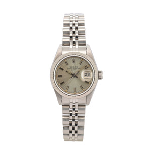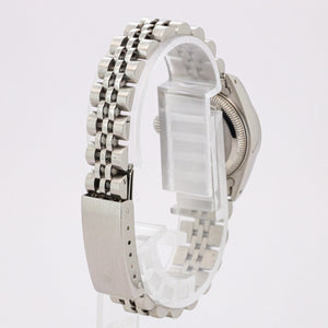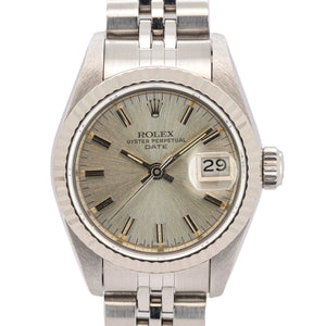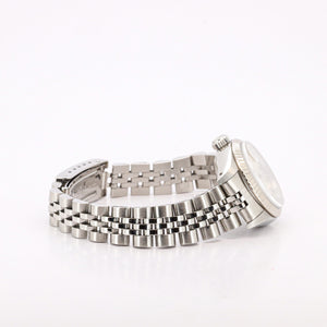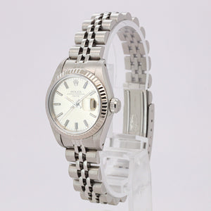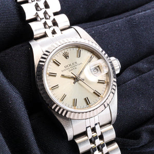 Zum Verkauf steht eine äußerst elegante Rolex Lady-Datejust 26mm, Referenz 69174, aus dem Jahr 1985. Dieses Modell zählt zu den ikonischsten Damenuhren von Rolex und verbindet klassische Schönheit mit der für Rolex typischen Robustheit und Präzision. Die Uhr präsentiert sich in einer edlen Edelstahl-/Weißgold-Kombination, ergänzt durch ein zeitloses silbernes Zifferblatt, das ihr eine besonders harmonische und zurückhaltend luxuriöse Ausstrahlung verleiht.