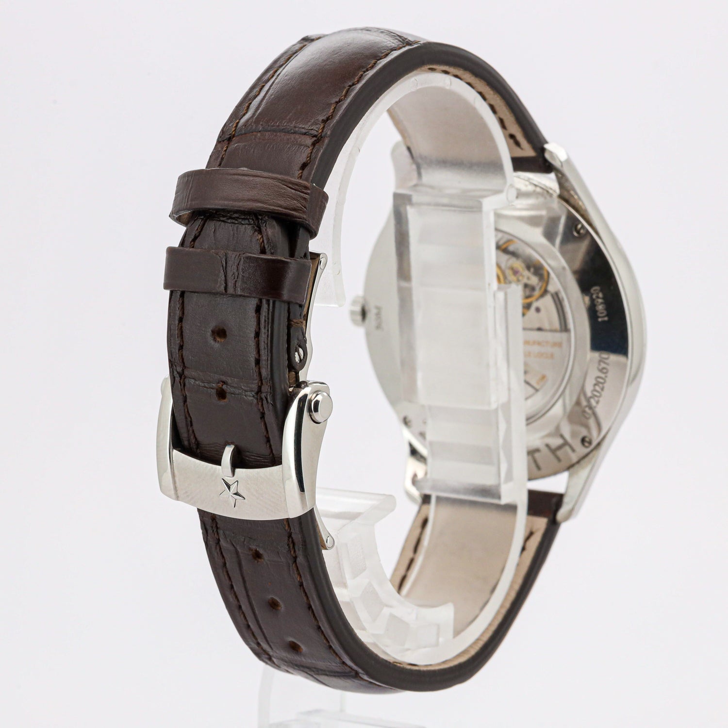 Das 40 mm Edelstahlgehäuse überzeugt durch ausgewogene Proportionen, fein polierte Oberflächen und eine harmonische Linienführung. Das silberne Zifferblatt mit edlem Sonnenschliff sorgt für ein faszinierendes Spiel aus Licht und Schatten, während applizierte Indizes und schlanke Zeiger eine hervorragende Ablesbarkeit gewährleisten. Die zentral angeordnete Sekunde unterstreicht den klassischen Charakter dieser eleganten Dresswatch.