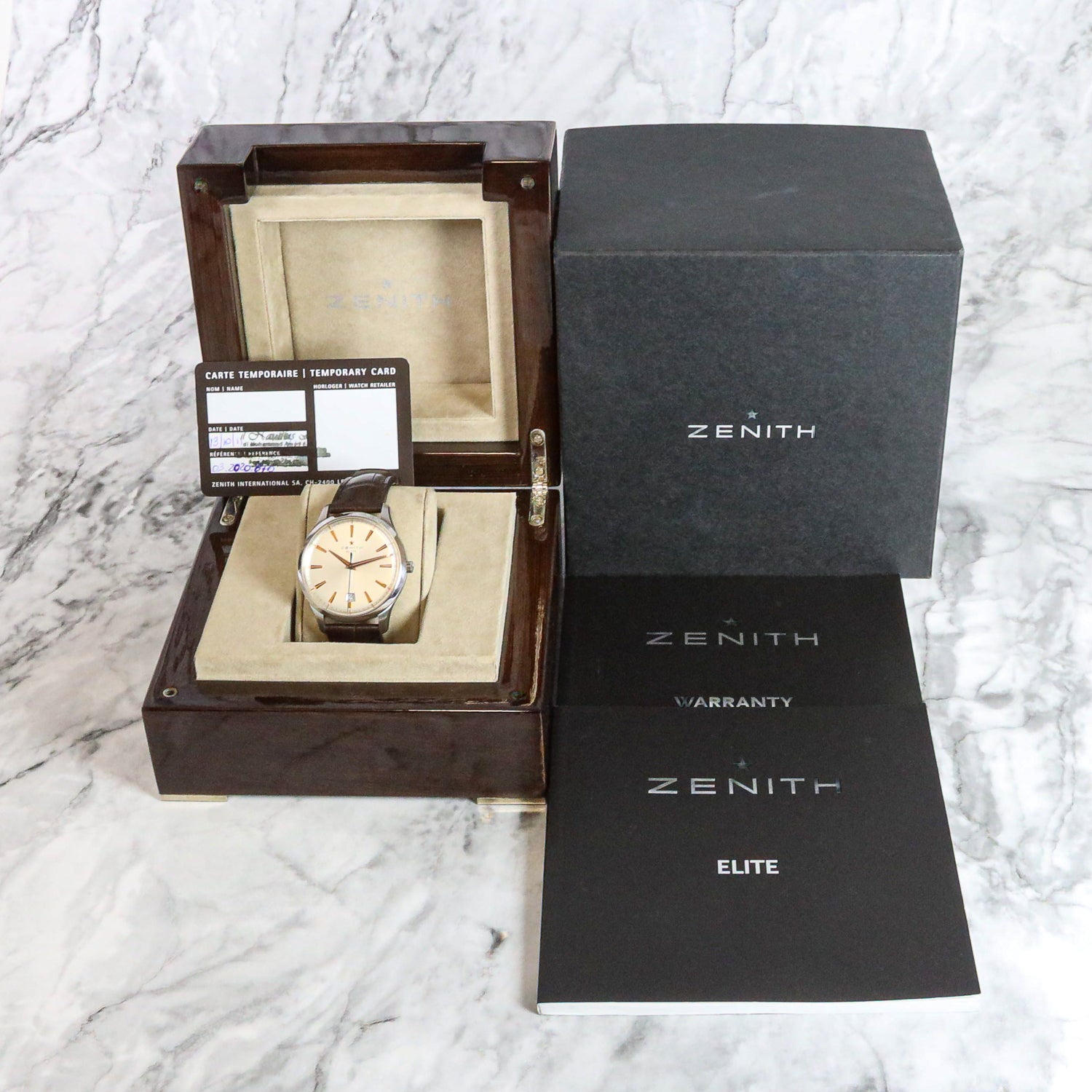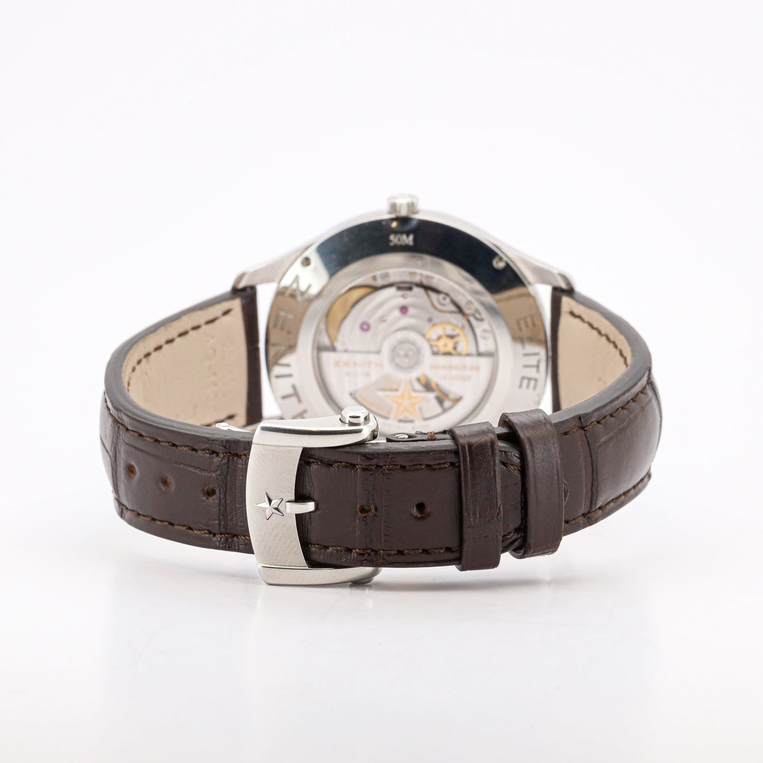 Im Inneren arbeitet das Zenith Manufakturkaliber Elite 670, ein Automatikwerk mit 27 Rubinen, einer Gangreserve von ca. 50 Stunden und einer Frequenz von 28.800 Halbschwingungen pro Stunde. Durch den Saphirglasboden lässt sich das fein dekorierte Werk in seiner ganzen Schönheit bewundern.