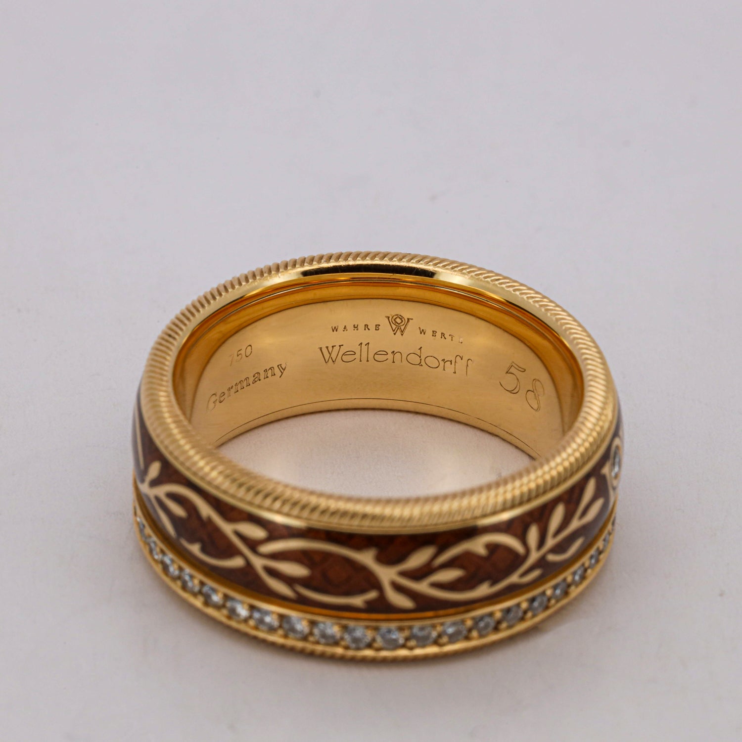Strahlende Brillanten setzen elegante Akzente und unterstreichen den luxuriösen Charakter dieses Meisterwerks. Mit einem Gewicht von 16,27 g vermittelt der Ring eine hochwertige, angenehm substanzielle Haptik, während die bekannte drehbare Wellendorff-Ringschiene für außergewöhnlichen Tragekomfort sorgt.